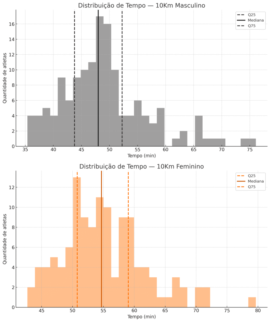 No feminino, o Q1 em 55:27 e a mediana próxima de 1h reforçam uma evolução clara no ritmo médio das atletas em provas de 10 km, com um pelotão numeroso girando na faixa de 5:50 a 6:10/km.