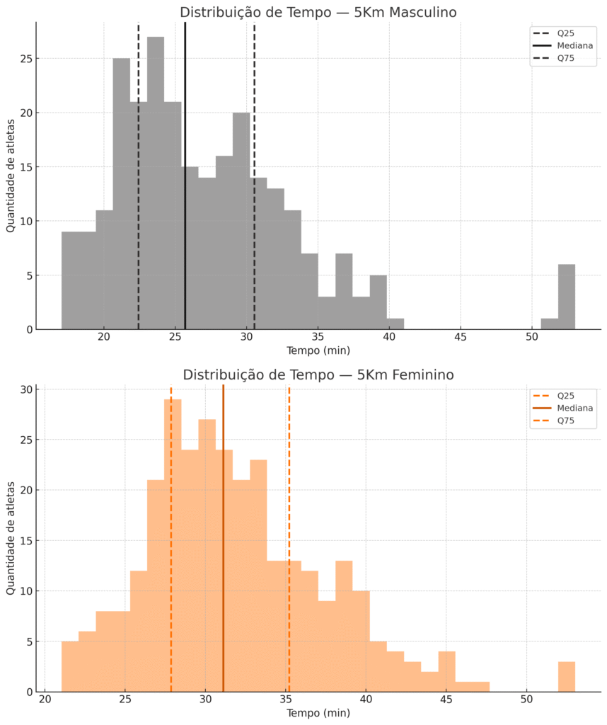 Nos 5 km, o masculino apresentou um bloco rápido logo no primeiro quartil, abaixo de 22 minutos, o que sinaliza um nível técnico elevado entre os mais velozes. A mediana em 25:41 mostra um pelotão central firme, mantendo ritmo próximo de 5:08/km.